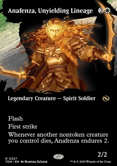 Flash First strike Whenever another nontoken creature you control dies, Anafenza endures 2. (Put two +1/+1 counters on it or create a 2/2 white Spirit creature token.)