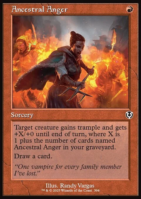 Target creature gains trample and gets +X/+0 until end of turn, where X is 1 plus the number of cards named Ancestral Anger in your graveyard. Draw a card.