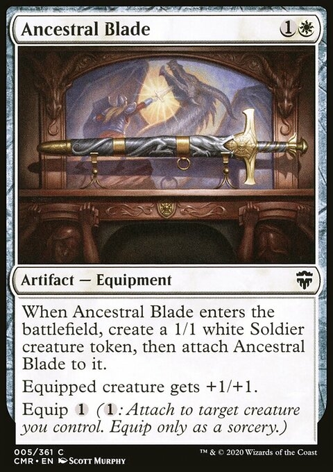 When Ancestral Blade enters the battlefield, create a 1/1 white Soldier creature token, then attach Ancestral Blade to it. Equipped creature gets +1/+1. Equip {1} ({1}: Attach to target creature you control. Equip only as a sorcery.)