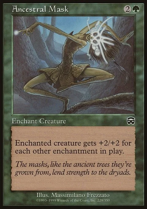 Enchant creature Enchanted creature gets +2/+2 for each other enchantment on the battlefield.
