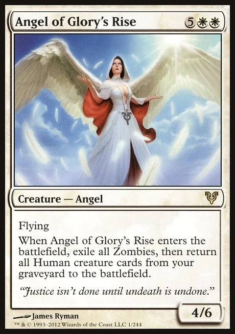 Flying When Angel of Glory's Rise enters the battlefield, exile all Zombies, then return all Human creature cards from your graveyard to the battlefield.