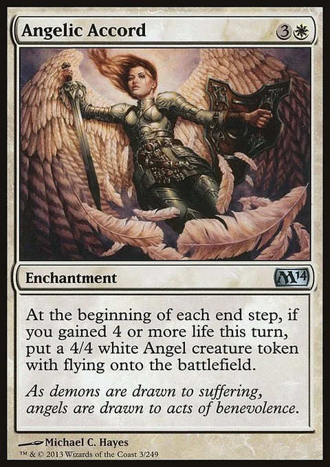 At the beginning of each end step, if you gained 4 or more life this turn, create a 4/4 white Angel creature token with flying.
