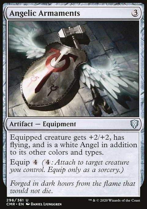 Equipped creature gets +2/+2, has flying, and is a white Angel in addition to its other colors and types. Equip {4} ({4}: Attach to target creature you control. Equip only as a sorcery.)