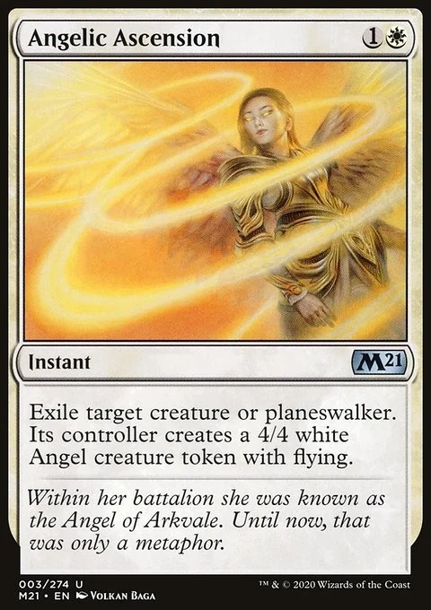 Exile target creature or planeswalker. Its controller creates a 4/4 white Angel creature token with flying.