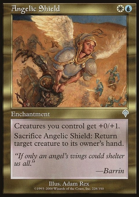 Creatures you control get +0/+1. Sacrifice Angelic Shield: Return target creature to its owner's hand.