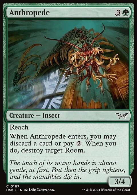 Reach When this creature enters, you may discard a card or pay {2}. When you do, destroy target Room.