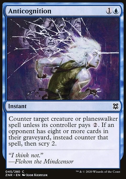Counter target creature or planeswalker spell unless its controller pays {2}. If an opponent has eight or more cards in their graveyard, instead counter that spell, then scry 2.