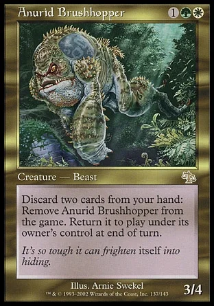 Discard two cards from your hand: Remove Anurid Brushhopper from the game. Return it to play under its owner`s control at end of turn.