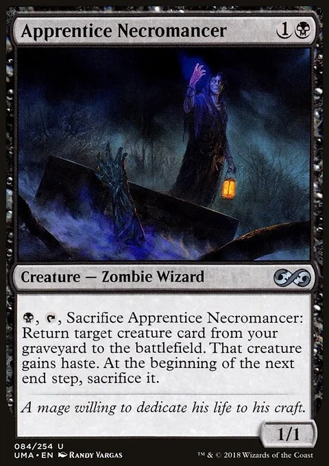 {B}, {T}, Sacrifice Apprentice Necromancer: Return target creature card from your graveyard to the battlefield. That creature gains haste. At the beginning of the next end step, sacrifice it.