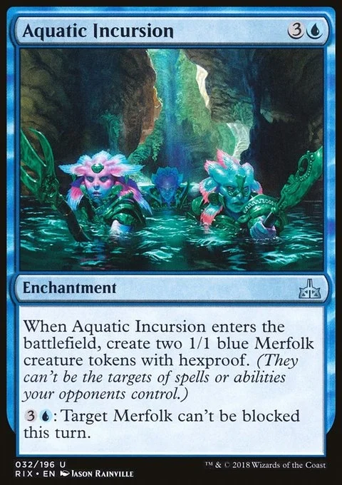 When Aquatic Incursion enters the battlefield, create two 1/1 blue Merfolk creature tokens with hexproof. (They can't be the targets of spells or abilities your opponents control.) {3}{U}: Target Merfolk can't be blocked this turn.