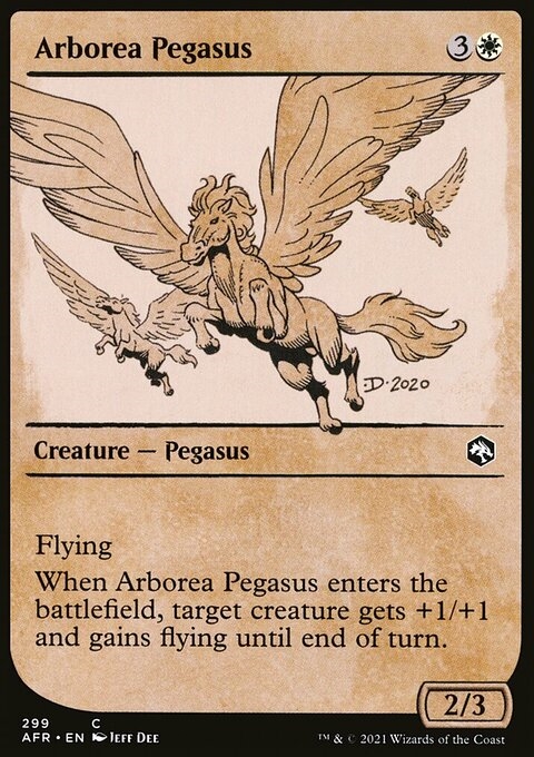 Flying When Arborea Pegasus enters the battlefield, target creature gets +1/+1 and gains flying until end of turn.