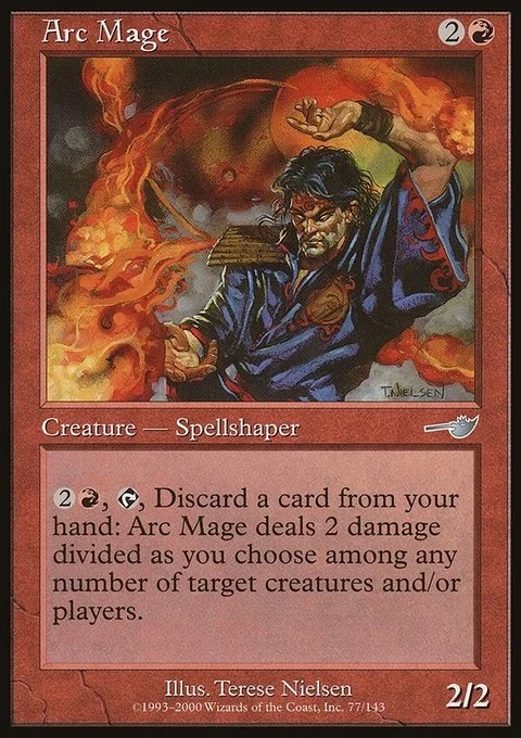 {2}{R}, {T}, Discard a card: Arc Mage deals 2 damage divided as you choose among one or two targets.