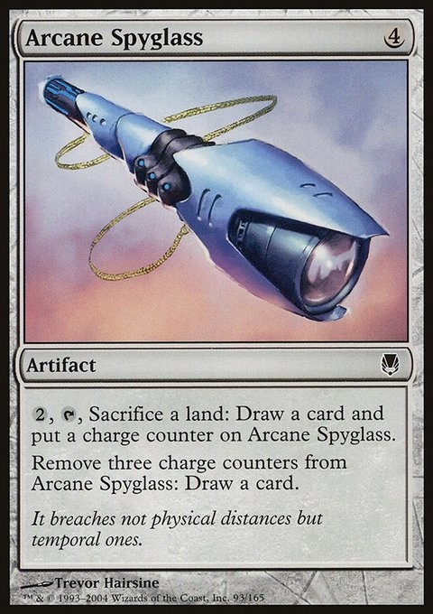 {2}, {T}, Sacrifice a land: Draw a card and put a charge counter on Arcane Spyglass. Remove three charge counters from Arcane Spyglass: Draw a card.