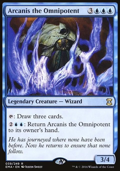 {T}: Draw three cards. {2}{U}{U}: Return Arcanis the Omnipotent to its owner's hand.