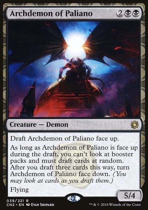 As long as Archdemon of Paliano is face up during the draft, you can't look at booster packs and must draft cards at random. After you draft three cards this way, turn Archdemon of Paliano face down. (You may look at cards as you draft them.)