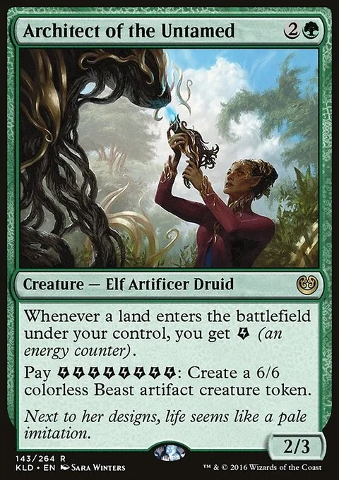 Landfall — Whenever a land enters the battlefield under your control, you get {E} (an energy counter). Pay {E}{E}{E}{E}{E}{E}{E}{E}: Create a 6/6 colorless Beast artifact creature token.
