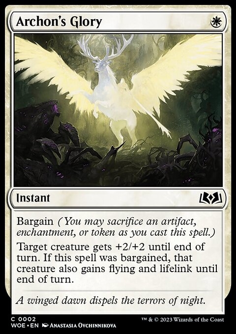 Bargain (You may sacrifice an artifact, enchantment, or token as you cast this spell.) Target creature gets +2/+2 until end of turn. If this spell was bargained, that creature also gains flying and lifelink until end of turn.