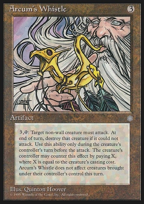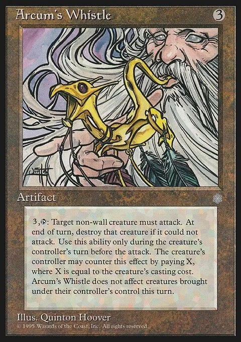3, T: Target non-wall creature must attack. At end of turn, destroy that creature if it could not attack. Use this ability only during the creature’s controller’s turn before the attack. The creature’s controller may counter this effect by paying X, where X is equal to the creature’s casting cost. Arcum’s Whistle does not affect creatures brought under their controller’s control this turn.