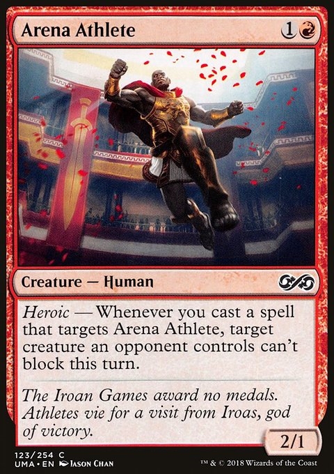 Heroic — Whenever you cast a spell that targets Arena Athlete, target creature an opponent controls can't block this turn.