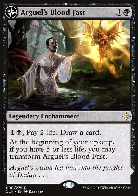 At the beginning of your upkeep, if you have 5 or less life, you may transform Arguel's Blood Fast.