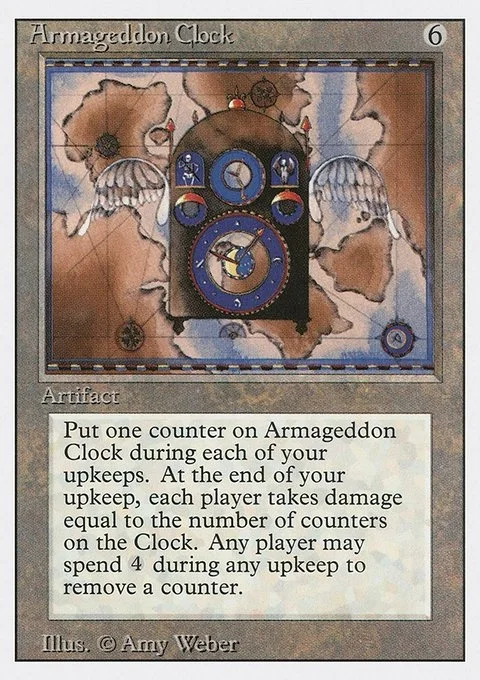 Put one counter on Armageddon Clock during each of your upkeeps. At the end of your upkeep, each player takes damage equal to the number of counters on the Clock. Any player may spend 4 during any upkeep to remove a counter.