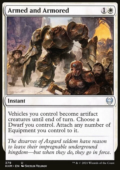 Vehicles you control become artifact creatures until end of turn. Choose a Dwarf you control. Attach any number of Equipment you control to it.