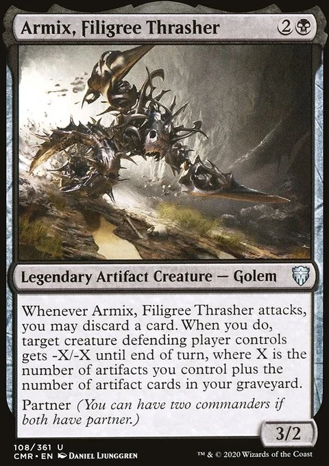 Whenever Armix, Filigree Thrasher attacks, you may discard a card. When you do, target creature defending player controls gets -X/-X until end of turn, where X is the number of artifacts you control plus the number of artifact cards in your graveyard.