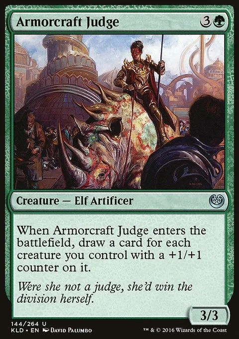 When Armorcraft Judge enters the battlefield, draw a card for each creature you control with a +1/+1 counter on it.