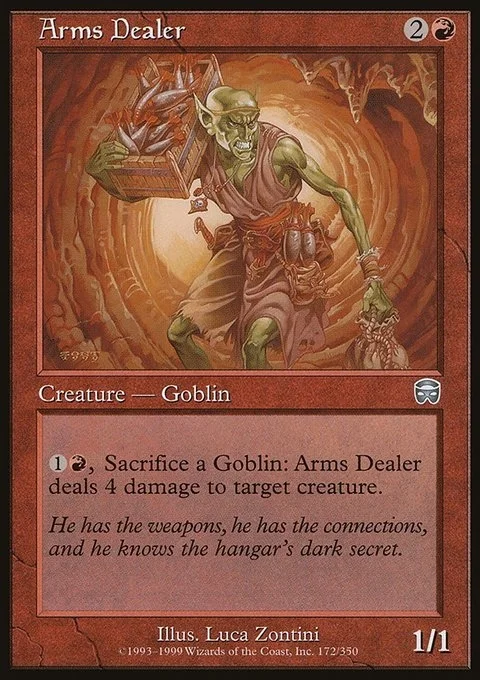 {1}{R}, Sacrifice a Goblin: Arms Dealer deals 4 damage to target creature.
