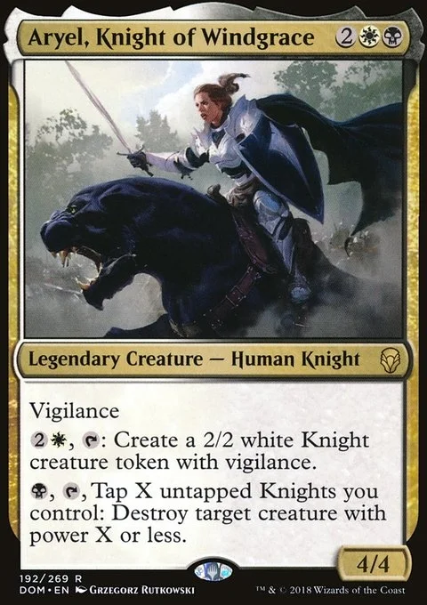 Vigilance {2}{W}, {T}: Create a 2/2 white Knight creature token with vigilance. {B}, {T}, Tap X untapped Knights you control: Destroy target creature with power X or less.