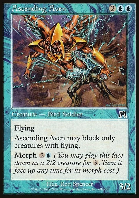 Flying Ascending Aven can block only creatures with flying. Morph {2}{U} (You may cast this card face down as a 2/2 creature for {3}. Turn it face up any time for its morph cost.)