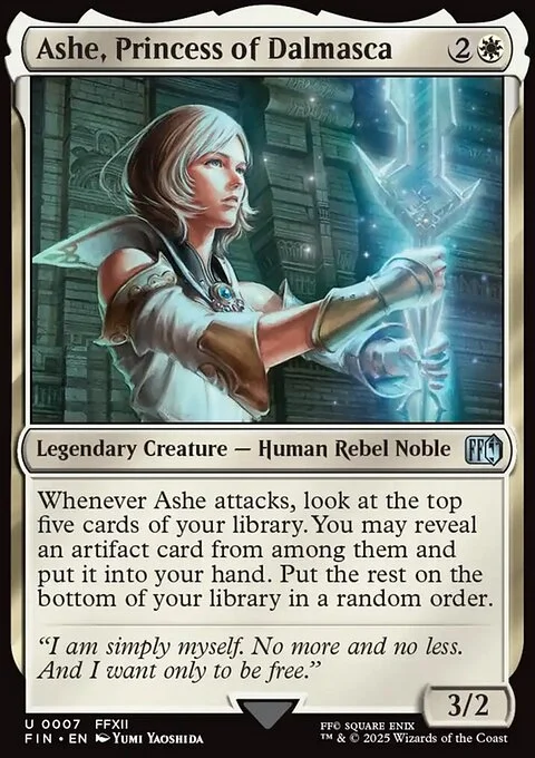 Whenever Ashe attacks, look at the top five cards of your library. You may reveal an artifact card from among them and put it into your hand. Put the rest on the bottom of your library in a random order.