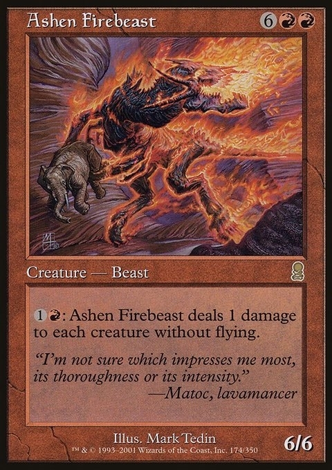 {1}{R}: Ashen Firebeast deals 1 damage to each creature without flying.