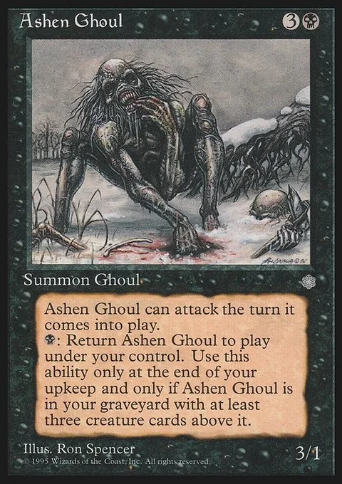 Ashen Ghoul can attack the turn it comes into play.B: Return Ashen Ghoul to play under your control. Use this ability only at the end of your upkeep and only if Ashen Ghoul is in your graveyard with at least three creature cards above it.
