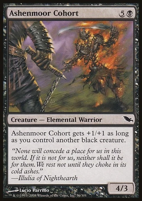 Ashenmoor Cohort gets +1/+1 as long as you control another black creature.