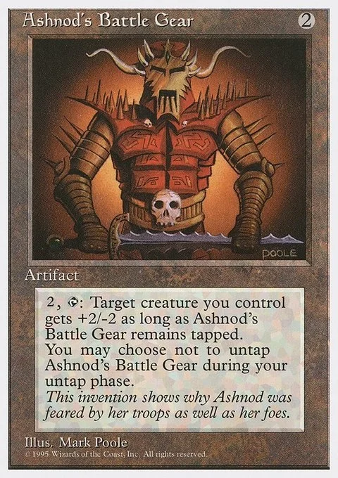 2, T: Target creature you control gets +2/-2 as long as Ashnod’s Battle Gear remains tapped. You may choose not to untap Ashnod’s Battle Gear during your untap phase.