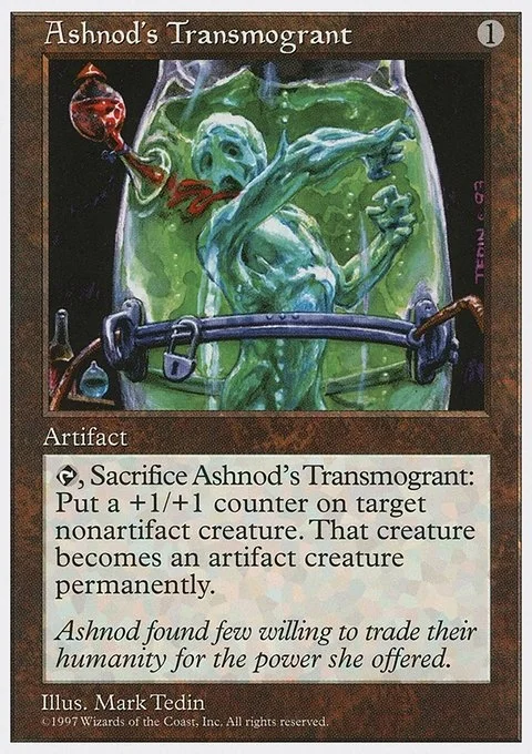 {T}, Sacrifice Ashnod's Transmogrant: Put a +1/+1 counter on target nonartifact creature. That creature becomes an artifact in addition to its other types.