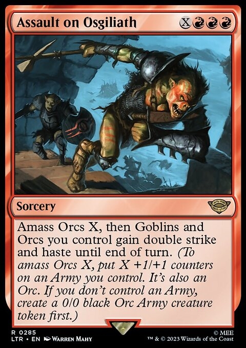 Amass Orcs X, then Goblins and Orcs you control gain double strike and haste until end of turn. (To amass Orcs X, put X +1/+1 counters on an Army you control. It's also an Orc. If you don't control an Army, create a 0/0 black Orc Army creature token first.)