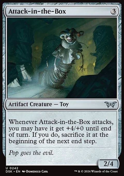 Whenever Attack-in-the-Box attacks, you may have it get +4/+0 until end of turn. If you do, sacrifice it at the beginning of the next end step.