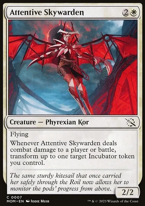 Flying Whenever Attentive Skywarden deals combat damage to a player or battle, transform up to one target Incubator token you control.
