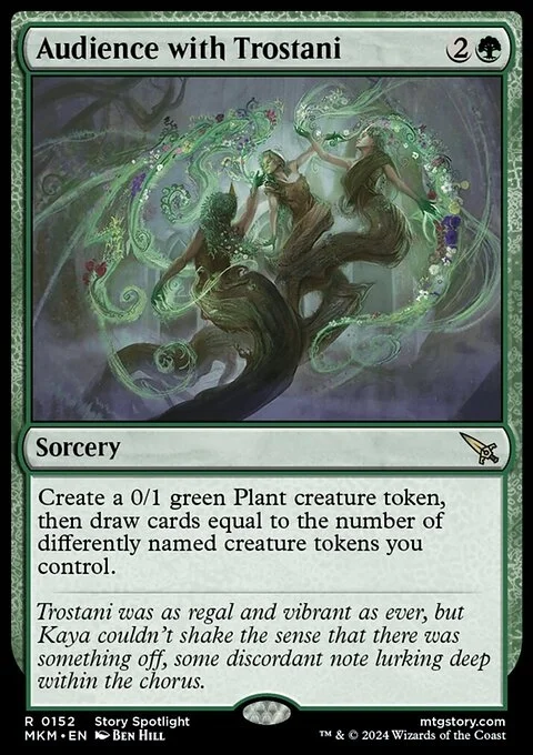 Create a 0/1 green Plant creature token, then draw cards equal to the number of differently named creature tokens you control.