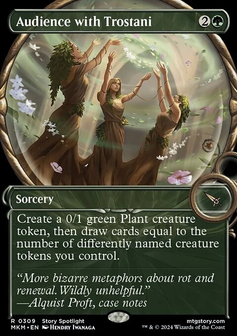 Create a 0/1 green Plant creature token, then draw cards equal to the number of differently named creature tokens you control.