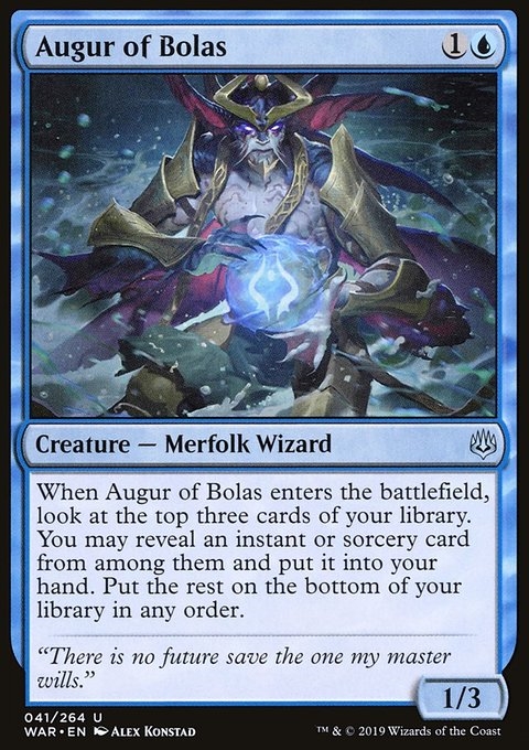When Augur of Bolas enters the battlefield, look at the top three cards of your library. You may reveal an instant or sorcery card from among them and put it into your hand. Put the rest on the bottom of your library in any order.