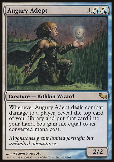 Whenever Augury Adept deals combat damage to a player, reveal the top card of your library and put that card into your hand. You gain life equal to its converted mana cost.