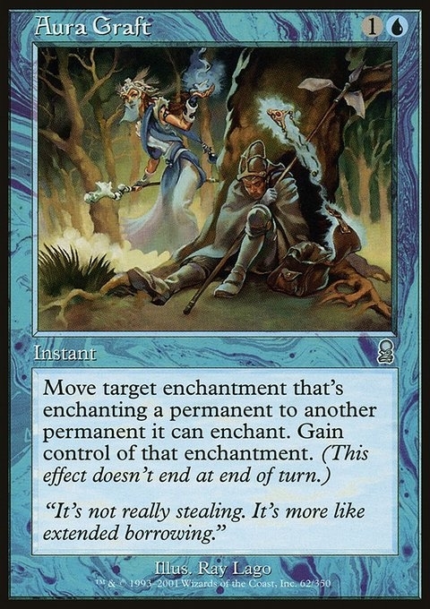 Gain control of target Aura that's attached to a permanent. Attach it to another permanent it can enchant.