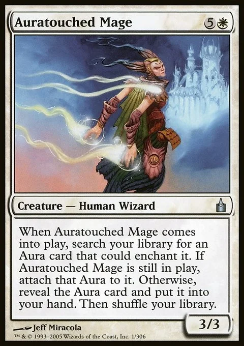 When Auratouched Mage enters the battlefield, search your library for an Aura card that could enchant it. If Auratouched Mage is still on the battlefield, put that Aura card onto the battlefield attached to it. Otherwise, reveal the Aura card and put it into your hand. Then shuffle.