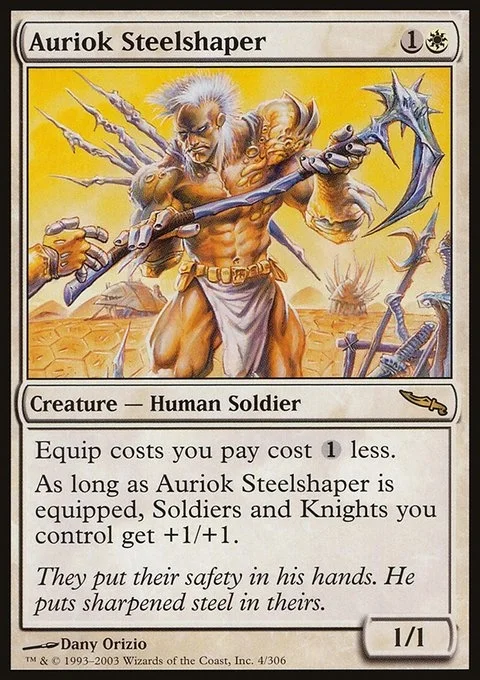 Equip costs you pay cost {1} less. As long as Auriok Steelshaper is equipped, each creature you control that's a Soldier or a Knight gets +1/+1.