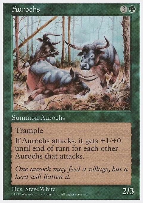 Trample Whenever Aurochs attacks, it gets +1/+0 until end of turn for each other attacking Aurochs.
