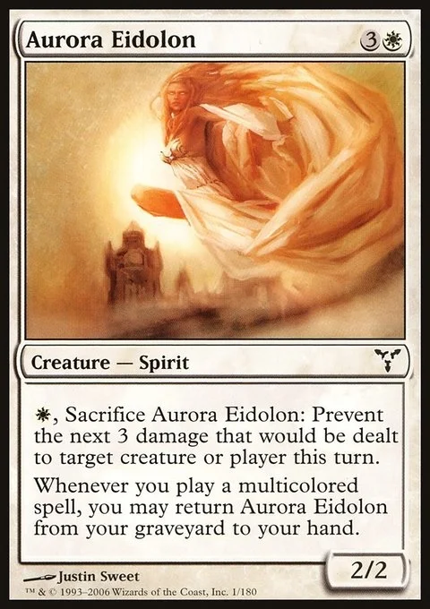 {W}, Sacrifice Aurora Eidolon: Prevent the next 3 damage that would be dealt to any target this turn. Whenever you cast a multicolored spell, you may return Aurora Eidolon from your graveyard to your hand.