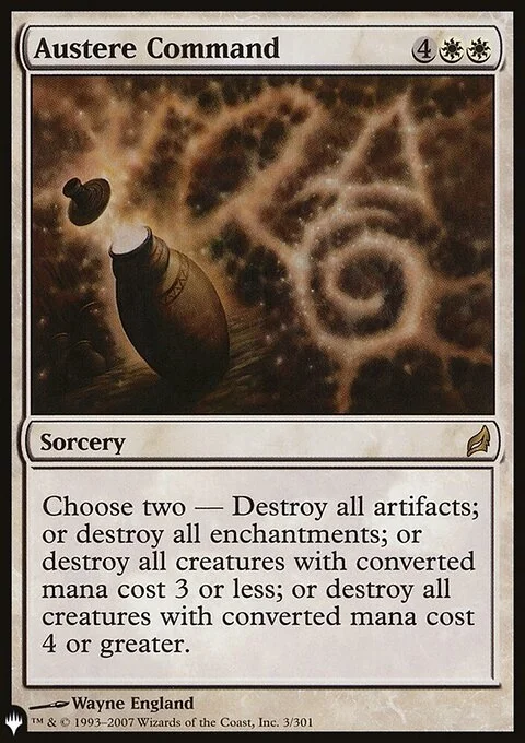 Choose two — • Destroy all artifacts. • Destroy all enchantments. • Destroy all creatures with mana value 3 or less. • Destroy all creatures with mana value 4 or greater.